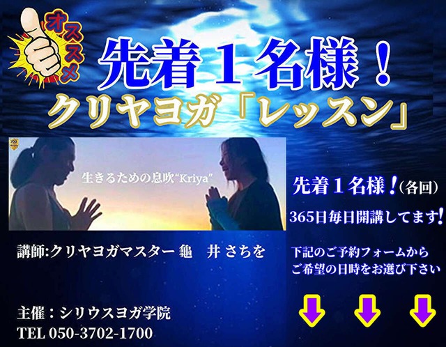 あなたの「心」と「体」と「魂」を磨く! 各回,先着1名様「クリヤヨガ・レッスン生」2024年度 募集のお知らせ 365日毎日開講しております! ご予約フォームからご希望の日時をお選び下さい メール確認後、【手続きについて】のメールをお送りいたします ※この商品はヨガレッスンのため、下記は該当しませんのでご了承ください 「鑑定書」兼資料は郵送(レターパック等)にてご自宅にお送りいたします ◆お申し込みの備考欄に下記をご記入ください ※記入漏れのないようにお願いします お名前(ふりがな): ご年令: メールアドレス: 連絡先電話番号: ご住所: ご希望の鑑定方法をお選びください:オンライン(Skypeスカイプ) ご希望の日程を第1希望から第5希望までご記入ください: 例)第1希望○月○日(月)、第2希望○月○日(火)、第3希望○月○日(水)、 第4希望○月○日(木)、 第5希望○月○日(土or日) (最低でも4週間以上は余裕をもってご記入ください。) ■時間割は4枠からお選びいただけます ▷13:00〜スタート ▷16:00〜スタート ▷20:00〜スタート ▷22:00〜スタート お支払い方法をお選びください:BASEで可能なお好きな決済からお選びください (振込明細書をもって領収書とし、別途領収書発行はいたしません。) 今回この鑑定は何をご覧になり知りましたか: 例)KriyaのWebサイト、メルマガ、note,twitter、YouTube ご質問などございましたら自由にご記入ください: